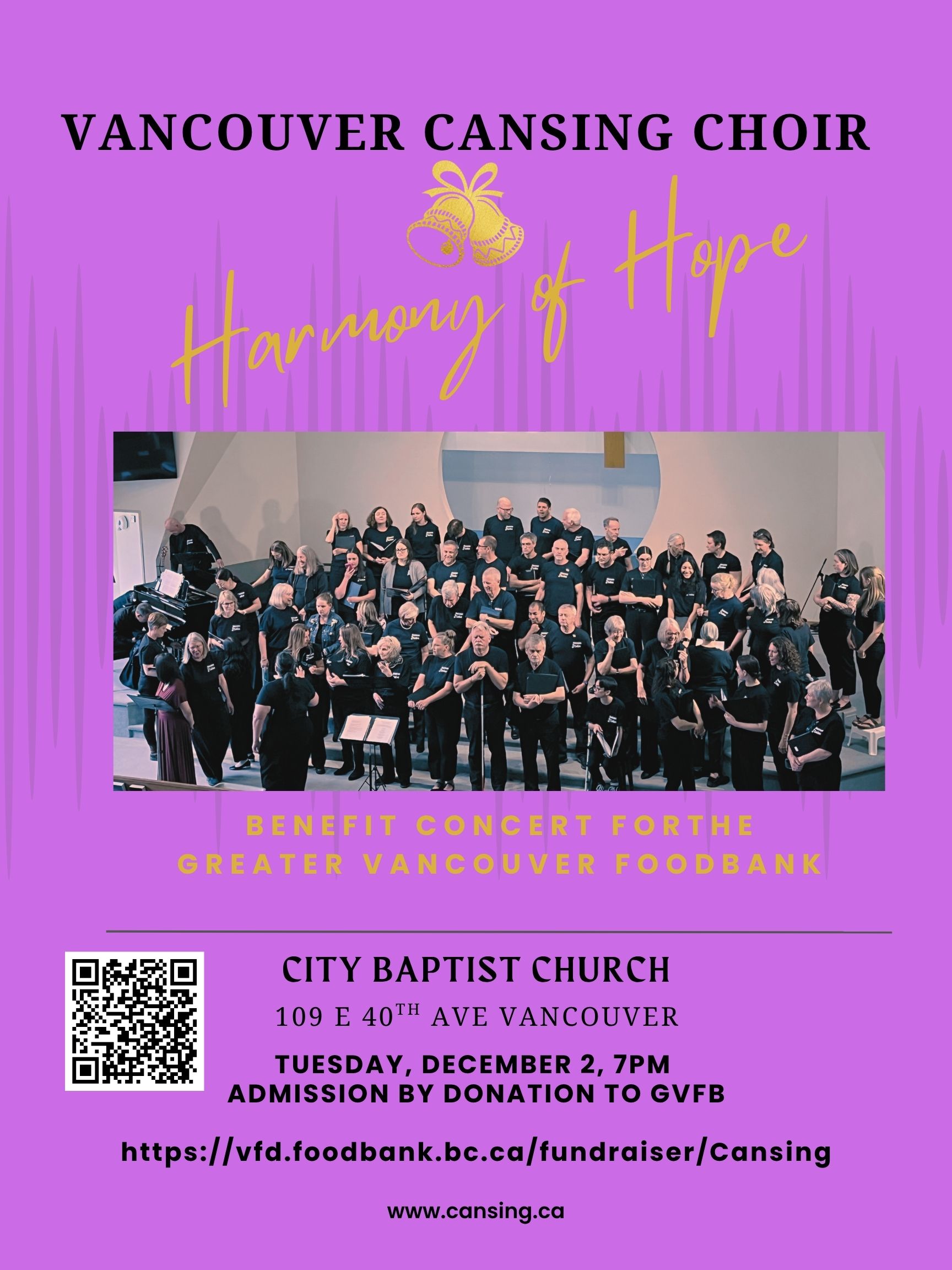 You are warmly invited to the Vancouver Cansing Choir’s winter concert, Harmony of HopeTuesday, December 2 • 7:00 PM, City Baptist Church (109 E 40th Ave, formerly Immanuelle Baptist Church) Admission is by donation to the Greater Vancouver Food Bank.Online giving link: https://vfd.foodbank.bc.ca/fundraiser/Cansing If you’re unable to attend, we would still be deeply grateful for […]