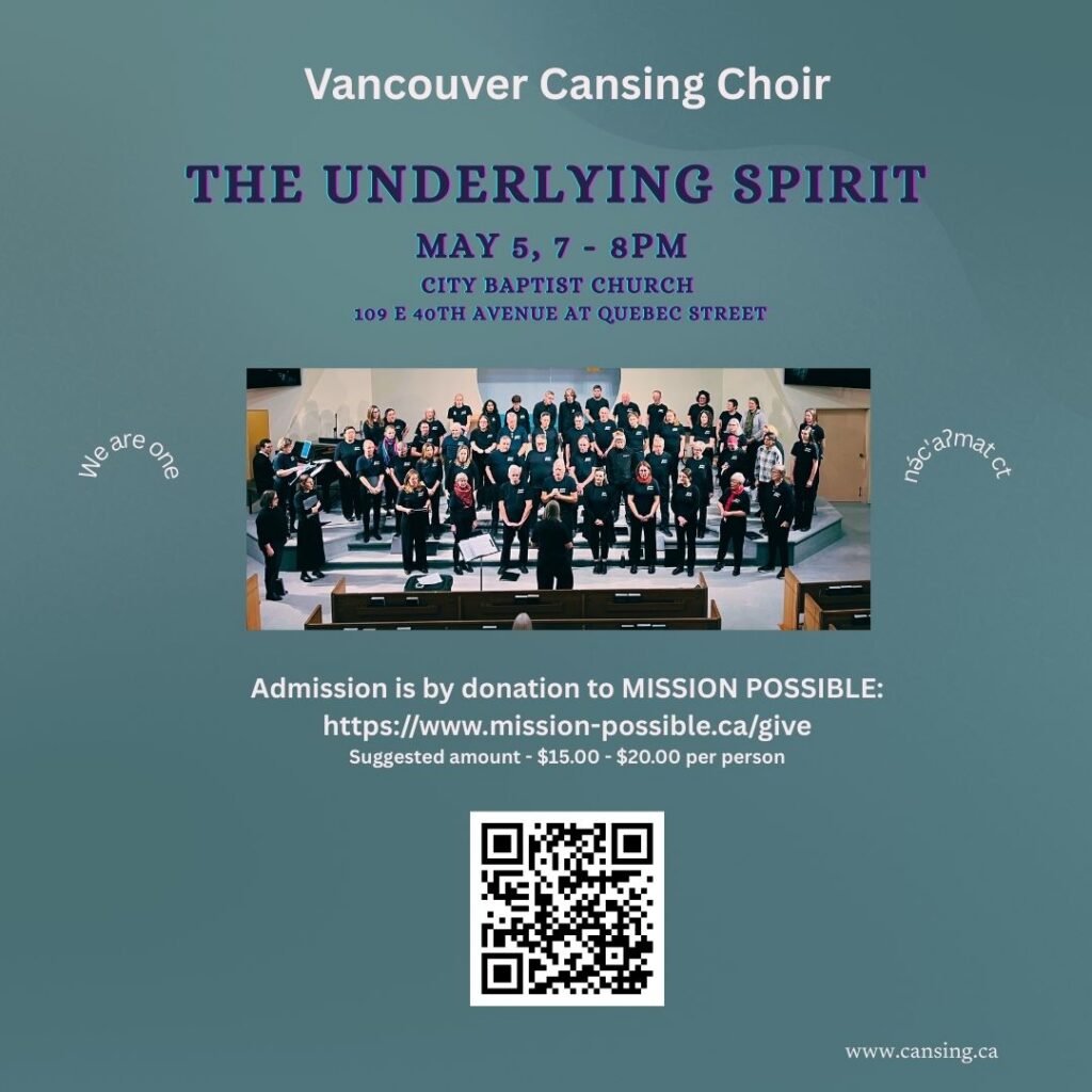 You are invited to the Vancouver Cansing Choir Spring Concert May 5, 2026, The Underlying Spirit, on Tuesday, May 5 at 7:00 PM at City Baptist Church (109 E 40th Ave, formerly Immanuel Baptist Church).